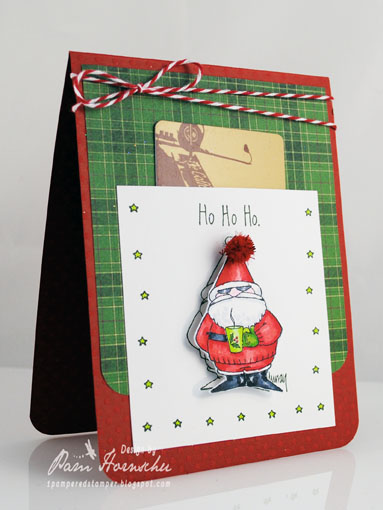 Quickie post today featuring the Ho Ho Ho Santa from the Murray's Law line of stamps from Gourmet Rubber Stamps. I love this line as they are full of sarcastic and cynical humor...the best kind. For this card, I created a pocket on the front of the card that will hold a gift card for a local coffee/tea/cocoa place (in my case...Coffee Bean & Tea Leaf). I have several more of cynical Santa, so be expecting to see more of him in future posts! Meanwhile, you can check out the entire line on the GRS website, along with several other lines including Lizzie Anne Designs.