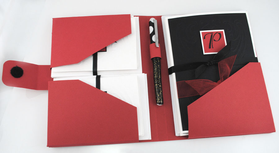 This portfolio would make a wonderful gift for a bride, or a terrific addition to a complete wedding look...Save the Dates, Invites, RSVPs, Thank Yous, etc. In this case, it is simply a set of notes with envelopes, tucked into little pockets, with the bride's new monogram. With