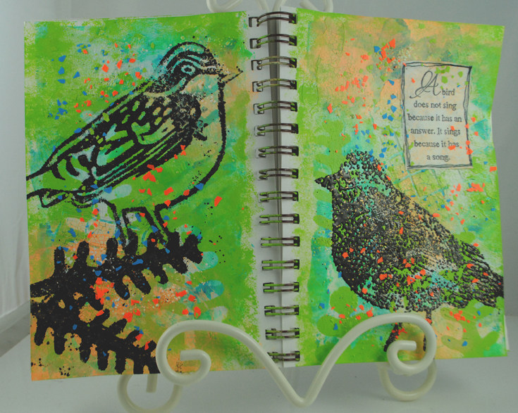 The page on the right follows similarly...only I used the stencil for sponging the paint through the leaf images, and the image was the Cling Rubber Bird, inked and embossed as before.